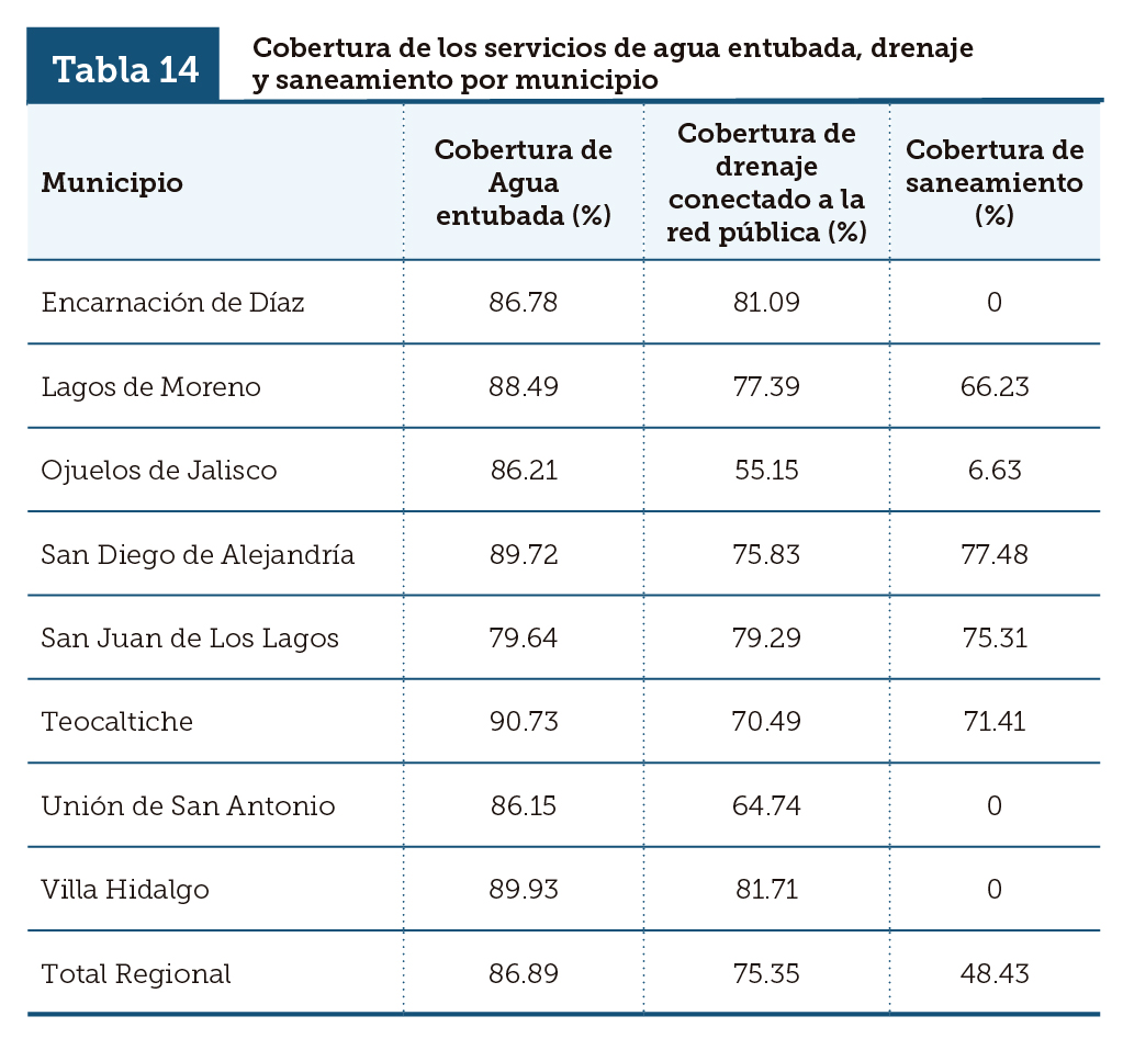 En la región Altos Norte la cobertura regional de agua potable es del 86.89%, la cobertura de drenaje conectado a la red pública de alcantarillado es del 75.35% y la cobertura de saneamiento es del 48.43% (tabla 14). Los municipios que muestran los mayores rezagos en la cobertura de los servicios mencionados anteriormente son: Unión de San Antonio, Ojuelos de Jalisco, Teocaltiche y Lagos de Moreno, así mismo el número de viviendas particulares habitadas que no disponen de agua entubada, drenaje y energía eléctrica supera el 16%.