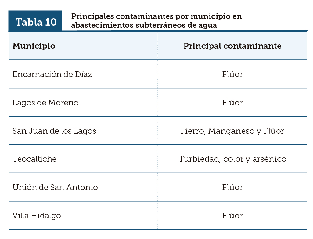 Cab e destacar que todos los municipios de la región presentan cierto grado de contaminación en sus cuerpos de agua superficiales, sin embargo, los que mostraron mayor grado de contaminación fueron: Lagos de Moreno, San Juan de los Lagos, Unión de San Antonio, Villa Hidalgo y en la última evaluación San Diego de Alejandría. De igual forma los municipios con mejor calidad de agua superficial son Encarnación de Díaz Ojuelos y Teocaltiche.