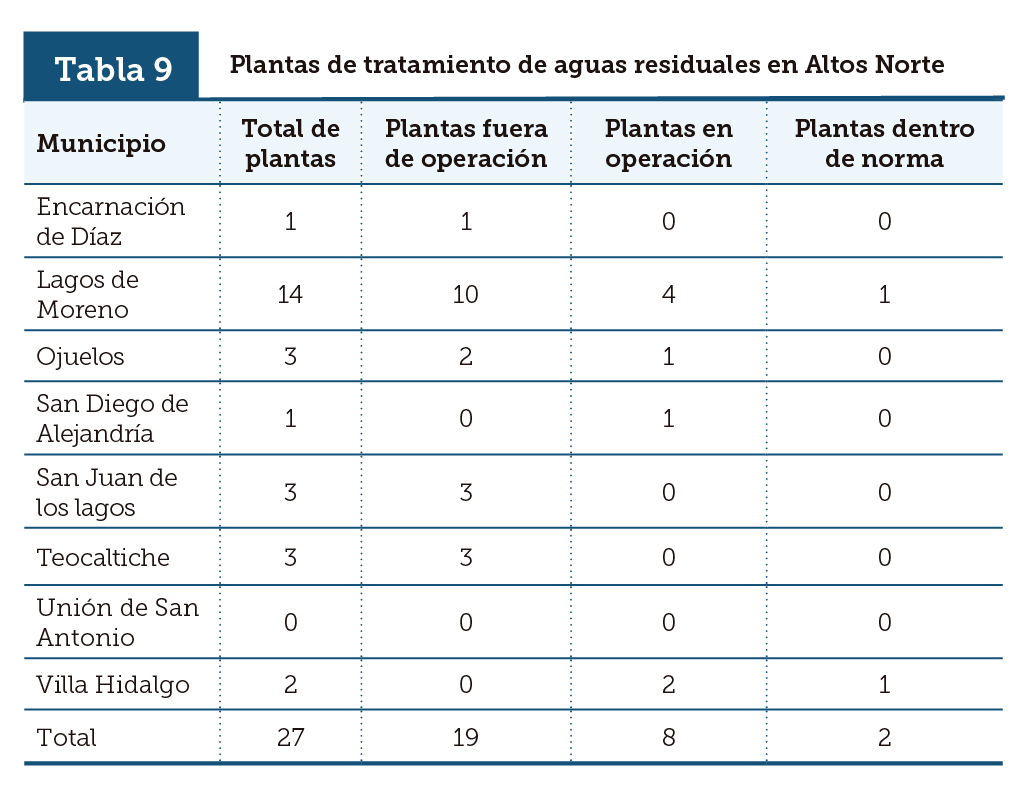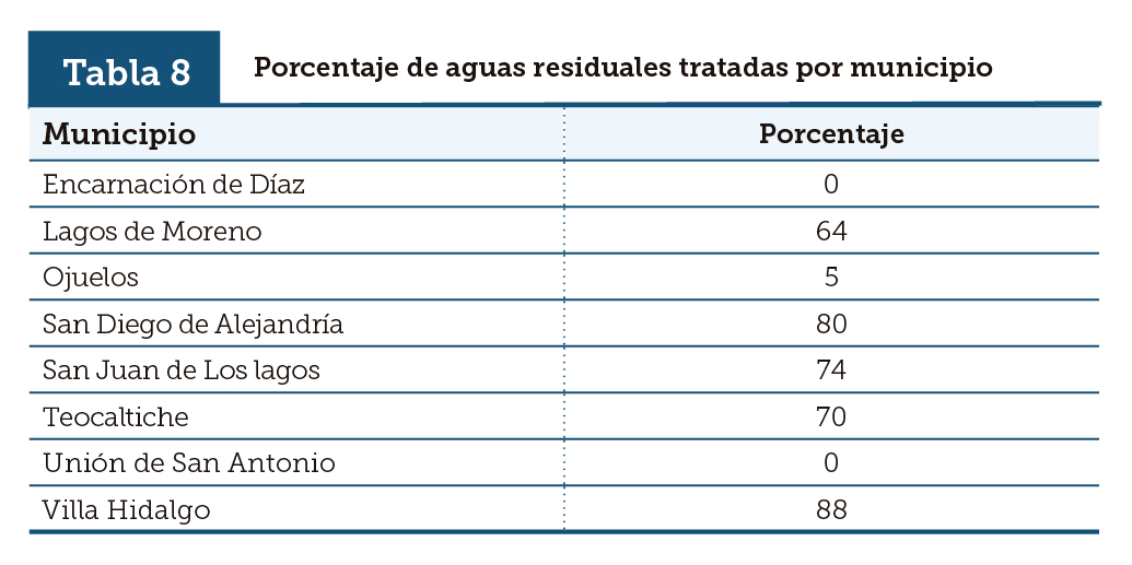 Así mismo uno de los principales factores para la contaminación de los cuerpos de agua en la región, está relacionado directamente con las descargas de aguas residuales de carácter doméstico sin tratamiento en ríos y arroyos, dos de los ocho municipios no realizan tratamiento de aguas (Encarnación de Díaz y Unión de San Antonio), de los seis municipios restantes que presentan algún sistema para el tratamiento de las aguas residuales, el de menor cobertura es Ojuelos de Jalisco con apenas el 5% (tabla 8).