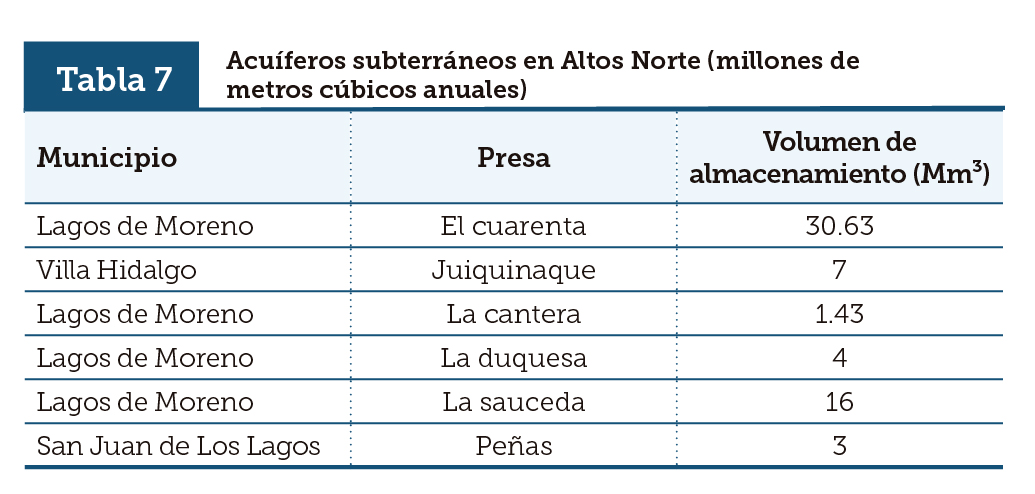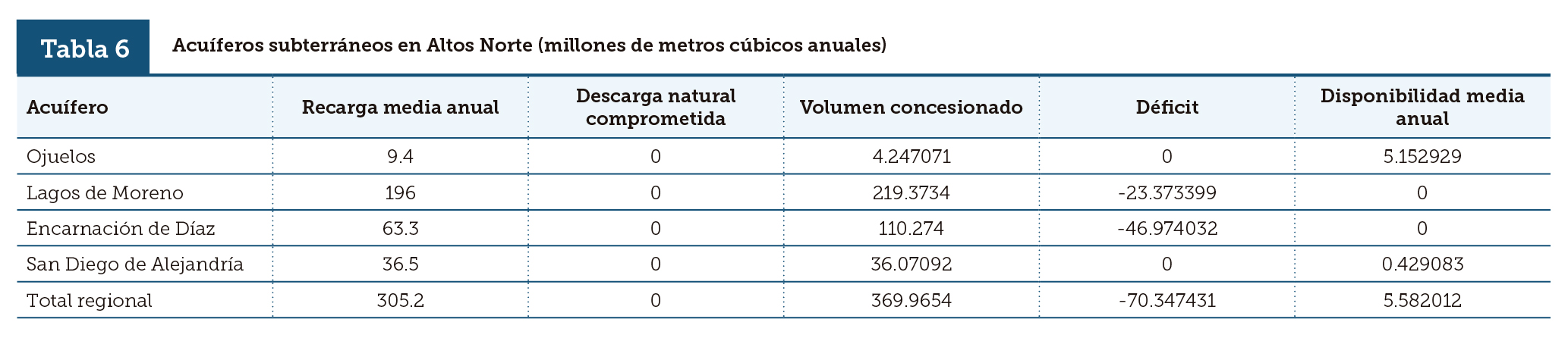 Según la Comisión Nacional del Agua (Conagua, 2015) en el estado de Jalisco existen 59 acuíferos, de los cuales 41 se encuentran sobre explotados, en la región Altos Norte de los cuatro acuíferos existentes dos muestran un déficit de 70 347 431 m³ anuales, provocando que la región presente una sobre explotación de los mantos subterráneos (tabla 6).