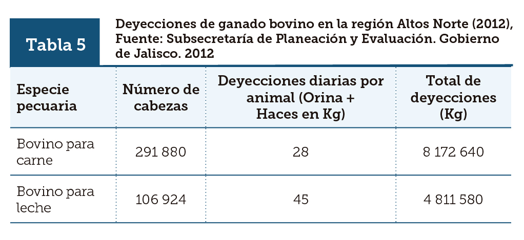 | Tabla 5 | Deyecciones de ganado bovino en la región Altos Norte (2012), Fuente: Subsecretaría de Planeación y Evaluación. Gobierno de Jalisco. 2012 |