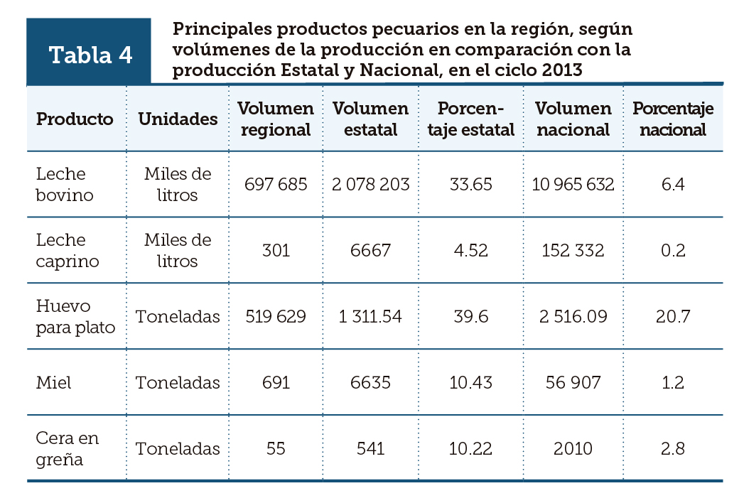 | Tabla 4 | Principales productos pecuarios en la región, según volúmenes de la producción en comparación con la producción estatal y nacional, en el ciclo 2013 |