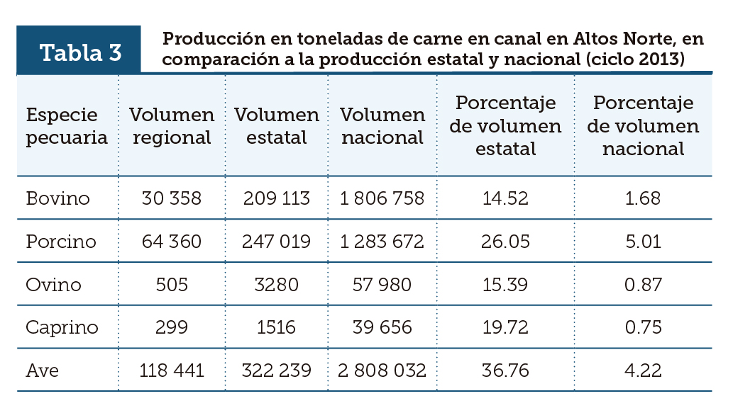 El valor de la producción ganadera en la región Altos Norte mantuvo una tendencia creciente durante el periodo 2009-2013, siendo este último año el que registró el mayor crecimiento en el valor de la producción ganadera, en ese mismo año la producción ganadera de la región contribuyó con el 32.3% del total estatal, siendo el más importante en comparación con años anteriores. Durante 2013 el principal producto del sector ganadero de la región fue el huevo para plato, con un valor de la producción de 10 588 millones de pesos y que representa el 49.8% del total de la producción, seguido por la carne de ave 18.4%; leche de bovino 15.8%; carne porcina 9.8%; carne bovina 5.9% y el restante 0.3% en otros productos (Servicio de Información Agroalimentaria y Pesquera [SIAP]/ Secretaría de Agricultura, Ganadería, Desarrollo Rural, Pesca y Alimentación [Sagarpa]/ Oficina Estatal de Información para el Desarrollo Rural Sustentable [Oeidrus], 2013). La producción de carne en canal de la región, comparada con la producción estatal y nacional se puede apreciar en la tabla 3, donde se destaca la producción de carne de ave (representando el 4. 22% de la producción nacional) y de porcino (5.01% de la producción nacional).