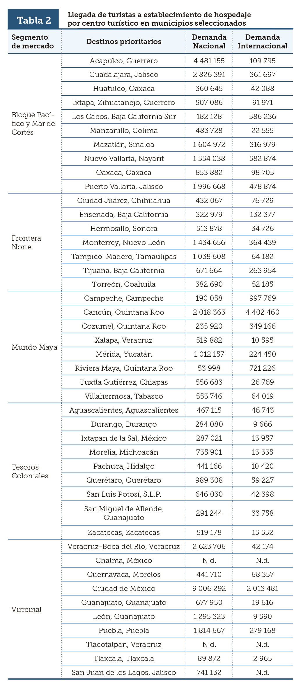 Si se revisan los datos por bloque o segmento en la tabla 2, claramente se pueden identificar tanto aquellos municipios que reciben un número importante turistas como aquellos que no muestran un nivel importante de demanda. En el bloque Pacífico, por ejemplo, destacan los municipios de Acapulco, Guadalajara, Mazatlán, Los Cabos, Nuevo Vallarta y Puerto Vallarta. De estos destinos, Acapulco es el que recibe más demanda nacional mientras que Los Cabos es el destino que más turistas internacionales acoge. En el bloque denominado Frontera Norte, destacan los destinos de Monterrey y Tampico-Madero, siendo el primero el que recibe una mayor cantidad de turistas tanto nacionales como extranjeros. En el bloque Mundo Maya, destacan claramente los destinos de Campeche, Cancún y Mérida. El destino que más turistas recibe tanto nacionales como extranjeros en este grupo es Cancún. Cabe mencionar que Campeche y la Riviera Maya son dos destinos que también reciben una cantidad considerable de turistas extranjeros. En el bloque Tesoros Coloniales, destacan los destinos de Querétaro, San Luis Potosí y Zacatecas. El destino que más turistas nacionales e internacionales recibe es Querétaro. Finalmente, en el bloque Virreinal, destacan los destinos de Puebla, León, Ciudad de México y Veracruz-Boca del Río. El destino que más destaca por su recepción de turistas nacionales y extranjeros es la Ciudad de México. Importante mencionar que en este bloque hay dos destinos donde no se cuenta con datos (los casos de Chalma y Tlacotalpan) y uno más que solo presenta datos de demanda nacional (el caso de San Juan de los Lagos).