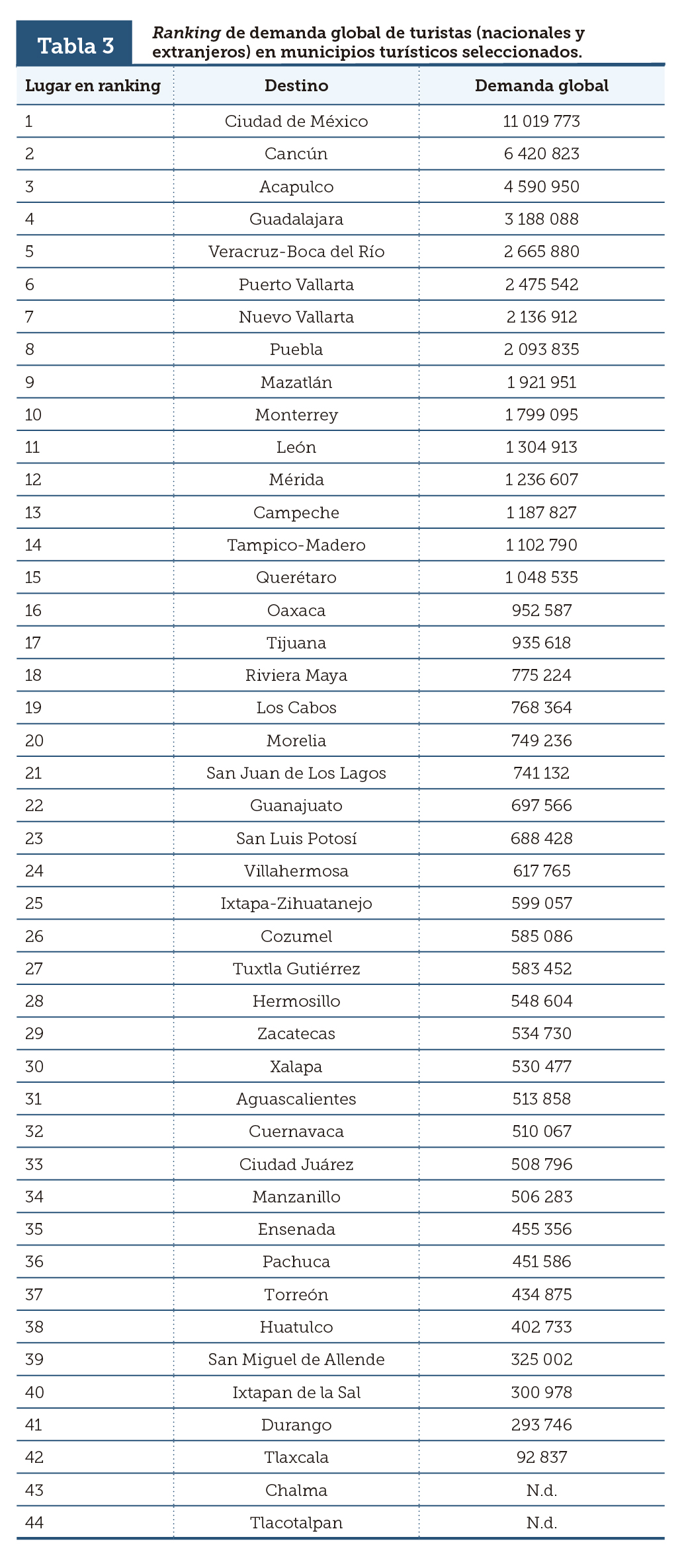 En lo que se refiere a la variable número de actividades turísticas, este estudio optó por recolectar información relacionada a la demanda efectiva en cada uno de los 44 destinos turísticos. Demanda efectiva o actual, de acuerdo con Sancho (1998) es: “el número de personas que participan en la actividad turística, es decir, que efectivamente viajan…este grupo es el que se mide más fácilmente y el que se encuentra reflejado en las estadísticas mundiales”. Para su estudio, esta demanda se puede dividir a su vez en dos grupos principales: demanda doméstica o nacional, y demanda internacional. Es importante mencionar que, algunos destinos reciben en mayor cantidad un tipo de demanda (ya sea nacional o internacional) y esto puede tener una repercusión directa, tanto en la configuración de la oferta turística local como en el nivel de gasto que realiza cada visitante. Para el objetivo de este estudio, se recolectaron ambas cifras por municipio provenientes del Sistema Nacional de Información Estadística del Sector turismo en México (Datatur, Análisis Integral de Turismo) en su versión más actualizada (año 2014). Una vez recolectados ambos datos, se calculó una cifra global para establecer un ranking de demanda en el grupo de destinos turísticos prioritarios asumiendo que si una localidad recibe un mayor número de visitantes que otra mayor será la posibilidad que se generen más actividades turísticas en el territorio.