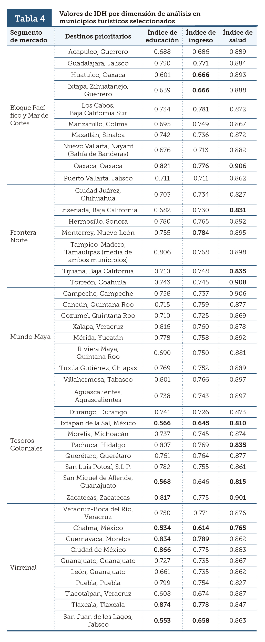 Para intentar calcular el volumen de actividades relacionadas a la industria turística en cada uno de los destinos, se consultaron las bases de datos municipales sobre demanda turística nacional y extranjera. Por otro lado, para intentar conocer el estado de bienestar de estas comunidades, se consultaron datos a nivel municipal del Programa de las Naciones Unidas para el Desarrollo (PNUD), de manera particular en lo que se refiere al Índice de Desarrollo Humano (IDH). Con el cruce de esta información, se intentó establecer si existe una relación recíproca, así como determinar el grado de incidencia del turismo en el tema del desarrollo humano.