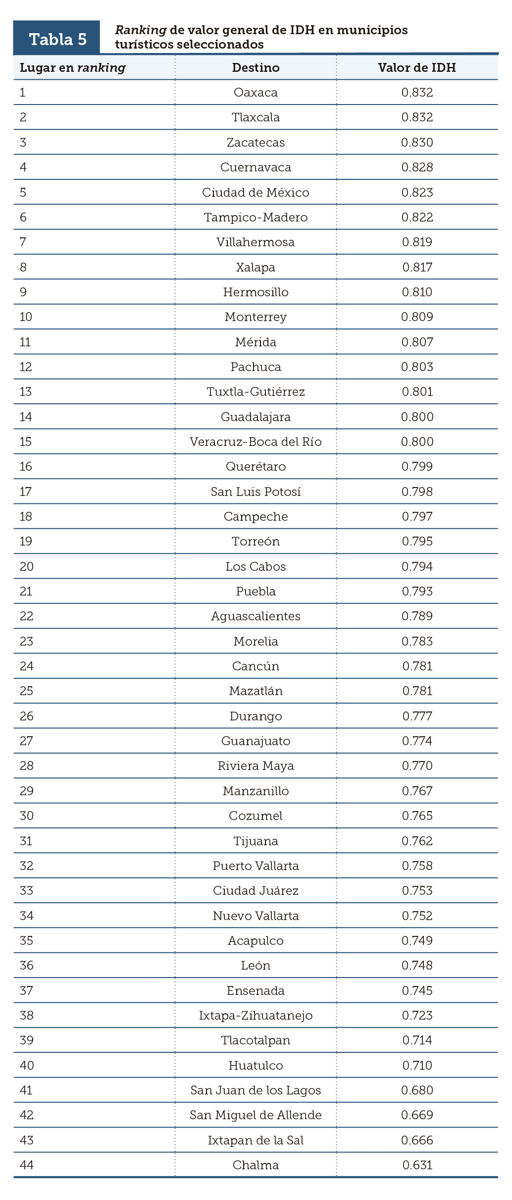La principal contribución de este estudio es la oportunidad de poder comparar los resultados tanto de la actividad turística como los del IDH. Hasta esta fecha, no existe un estudio que proponga un análisis similar, por lo que la información contenida en este artículo puede servir de base para futuros estudios y profundizar sobre la naturaleza de esta relación. El principal hallazgo se refiere al hecho que destinos prioritarios con una demanda turística importante, no presentan niveles de desarrollo humano superiores a aquellas localidades donde el turismo no es su principal actividad económica. Otro hallazgo importante derivado de este ejercicio de investigación es observar que municipios como Oaxaca, Tampico-Madero y Xalapa, presentan niveles de desarrollo humano considerablemente altos. Como se pudo apreciar en la figura 1, el municipio de Oaxaca pertenece a una de las entidades que posee la mayor cantidad de municipios con IDH muy bajos. Considerando lo anterior, es altamente dudoso como este municipio en particular pudo obtener evaluaciones tan altas en las tres dimensiones (educación, ingreso y salud) del IDH, a partir del contexto donde pertenece. En los casos de Tampico-Madero y Xalapa, también resaltan sus resultados altamente positivos en lo que se refiere a IDH, tomando en cuenta las condiciones de inseguridad actuales que prevalecen en las entidades a donde pertenecen. El fenómeno de manipulación de cifras (a nivel local, estatal o federal) pudiera ser una posibilidad en estos tres casos el que pudiera ayudar a explicar estos resultados. Sin embargo, no hay por el momento, información o evidencia que sustente tal aseveración.