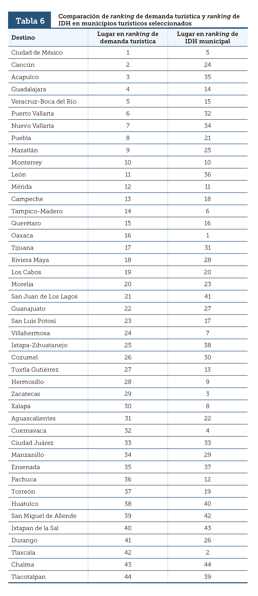 Finalmente, la tabla 6 concentra los resultados obtenidos tanto en el ranking de demanda global como en el ranking de IDH. Si se toma como variable de referencia la de demanda, se puede observar que no existe una relación determinante entre las actividades turísticas y los resultados de IDH. Destinos importantes de este grupo como Cancún, Acapulco, Puerto Vallarta, Nuevo Vallarta, Mazatlán, Campeche, Mérida, Los Cabos, Ixtapa-Zihuatanejo, Manzanillo y Huatulco, presentan niveles de desarrollo humano muy inferiores respecto de otros municipios que no reciben una demanda turística importante. Con excepción del caso de Cuernavaca, los municipios que parecen tener mejores niveles de desarrollo humano no serían tan dependientes de una sola actividad económica como es el turismo. Destaca también el hecho que destinos del interior que aparentemente gozan de una reputación turística importante (como los casos de San Miguel de Allende y Tlacotalpan, ambos reconocidos como patrimonio cultural de la humanidad por la Unesco) presenten niveles bajos de desarrollo humano en este grupo de 44 destinos. La siguiente sección de este artículo abordará temas que son importantes para la discusión de la relación entre el turismo y el desarrollo humano