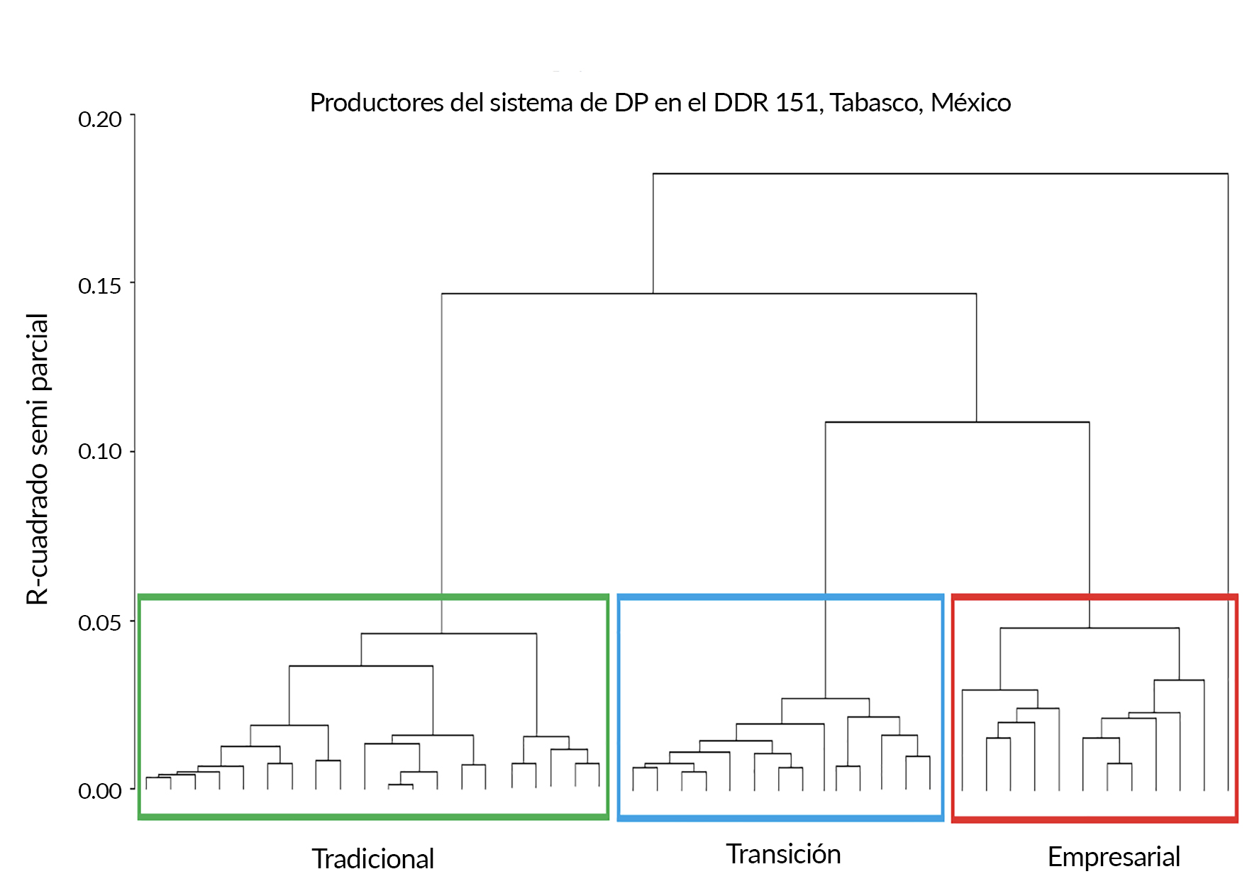 Dendograma de la tipología de productores del sistema de doble propósito (DP) en el Distritito de Desarrollo Rural (DDR) 151, Tabasco, México.