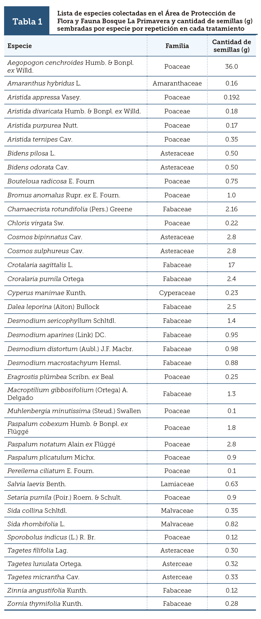 | Tabla 1 | Lista de especies colectadas en el Área de Protección de Flora y Fauna Bosque La Primavera y cantidad de semillas (g) sembradas por especie por repetición en cada tratamiento |