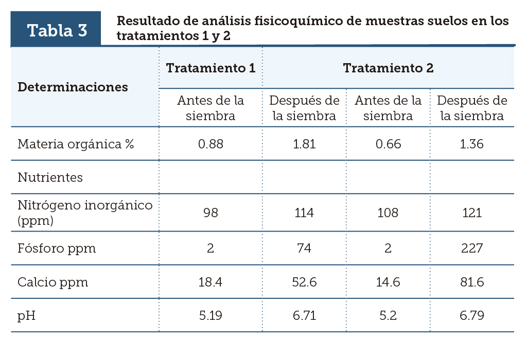 El análisis de los suelos reveló que al final del experimento en promedio la materia orgánica de las parcelas aumentó 51.42%; el fósforo 98.2%, en ambos tratamientos (T1 y T2). Mientras que el nitrógeno inorgánico fue el 14.03% y 10.74% en el T1 y T2, respectivamente. También el calcio en el T1 aumentó 65% y en el T2 82.1% (tabla 3).