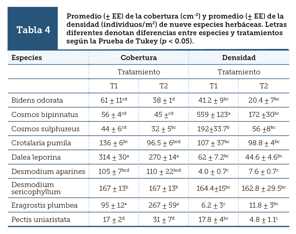 | Tabla 4 | Promedio (± EE) de la cobertura (cm-2) y promedio (± EE) de la densidad (individuos/m2) de nueve especies herbáceas. Letras diferentes denotan diferencias entre especies y tratamientos según la Prueba de Tukey (p < 0.05). |