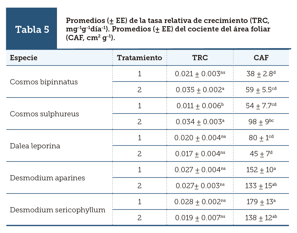 La tasa relativa de crecimiento no presentó diferencias estadísticas entre especies, ni entre tratamientos. Sin embargo, en la interacción especie × tratamiento se encontró diferencias (F = 4.5, p < 0.01). En el T2, Cosmos bipinnatus y C. sulphureus obtuvieron las tasas de crecimiento más altas; sin embargo, en el T2 C. sulphureus presentó el crecimiento más bajo (tabla 5). El Anova para el coeficiente del área foliar reveló diferencias entre especies (F = 49.37, p < 0.001), Desmodium sericophyllum y D. aparines presentaron en promedio 58.5% más CAF que Cosmos sulphureus, Dalea leporina y C. bipinnatus. Entre tratamientos no hubo respuesta. Sin embargo, la interacción especie y tratamiento reveló diferencias (F = 6.92, p < 0.001) (tabla 5), en el T1 Desmodium sericophyllum y D. aparines obtuvieron el CAF más alto, comparado con C. bipinnatus que fue el más bajo. La TAN varió entre especies (F = 12.13, p < 0.001). C. bipinnatus presentó una TAN 56.8 % más alta que el resto de las especies (Cosmos bipinnatus: 0.0006 ± 0.00004; Cosmos sulphureus: 0.0003 ± 0.00006; Dalea leporina: 0.0003 ± 0.00006; Desmodium aparines: 0.0002 ± 0.00003; Desmodium sericophyllum: 0.00015 ± 0.00003). Entre tratamientos ni su interacción con especies hubo diferencias.
