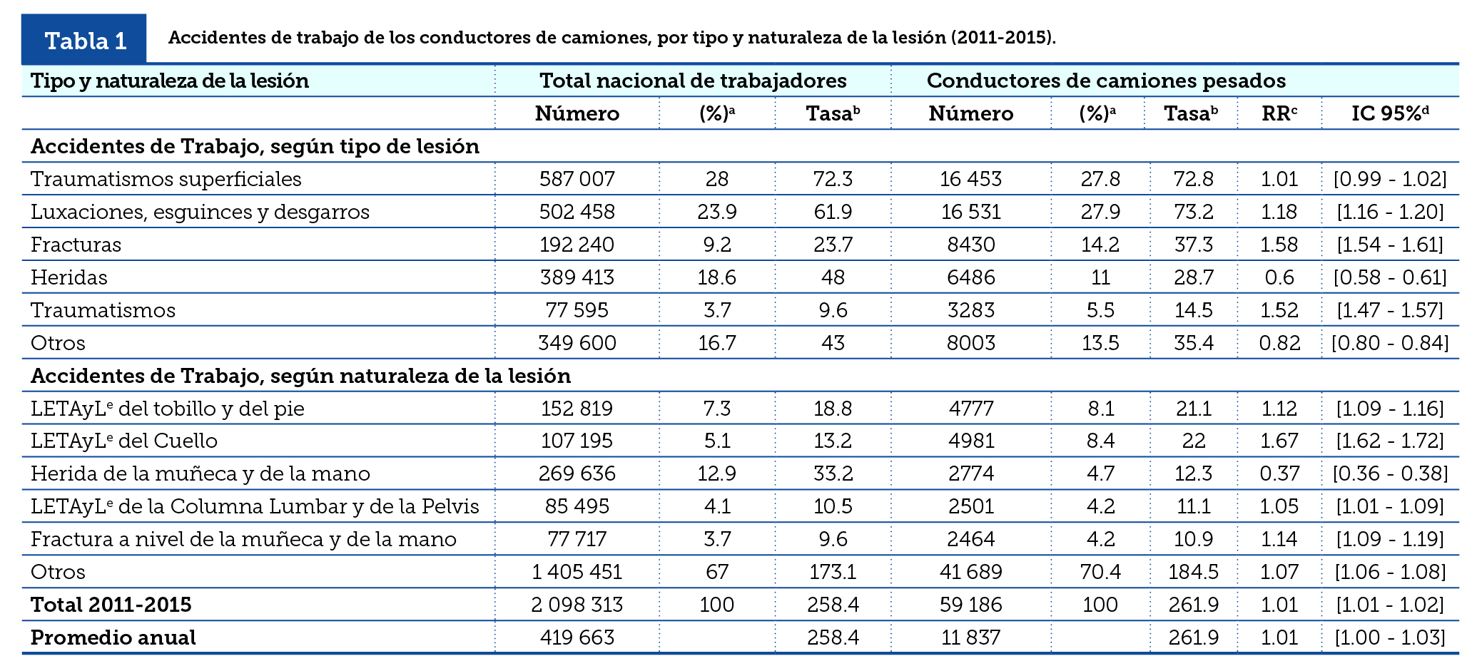 Asimismo, el IMSS (2016) registró 59 186 accidentes de trabajo para los conductores de vehículos de carga, 11 837 en promedio por año, por lo que se tiene una tasa de 2.6 accidentes por cada 100 trabajadores. En la tabla 1, se muestra el número de accidentes de trabajo según tipo y naturaleza de la lesión, tanto para los conductores de vehículos de carga como para el total nacional de trabajadores. Para ambos grupos, los traumatismos superficiales, las luxaciones, las fracturas y las heridas, en conjunto acumulan más de 80% de las lesiones, principalmente, en las zonas anatómicas del pie, tobillo, muñeca, mano y cuello. Sin embargo, en comparación con el total de los trabajadores, según el tipo de lesión, la razón de tasas de fracturas (RR = 1.58, IC 95% [1.54, 1.61]) y de traumatismos (RR = 1.52, IC 95% [1.47, 1.57]) son mayores para los conductores de camiones, mientras que para la naturaleza de la lesión, destacan las luxaciones, los esguinces y las torceduras de articulaciones y ligamentos del cuello (RR = 1.67, IC 95% [1.62, 1.72]).