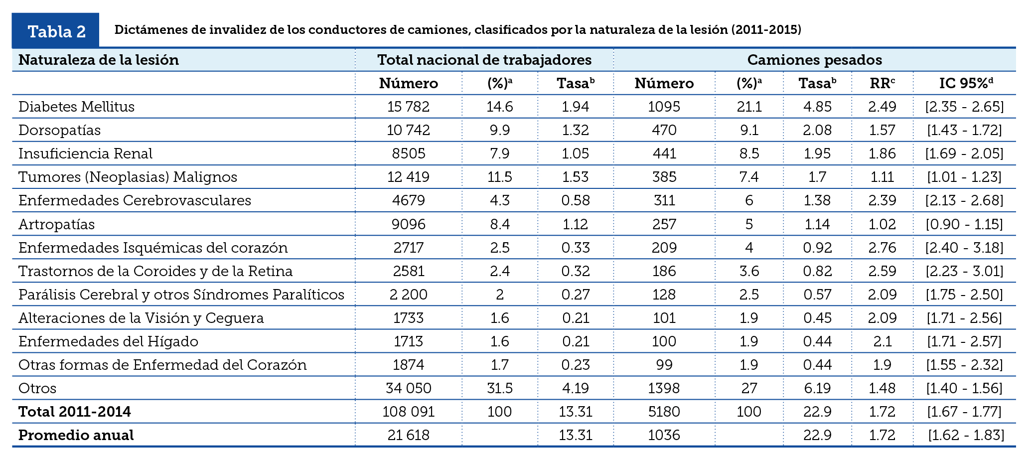 | Tabla 2 | Dictámenes de invalidez de los conductores de camiones, clasificados por la naturaleza de la lesión (2011-2015) |