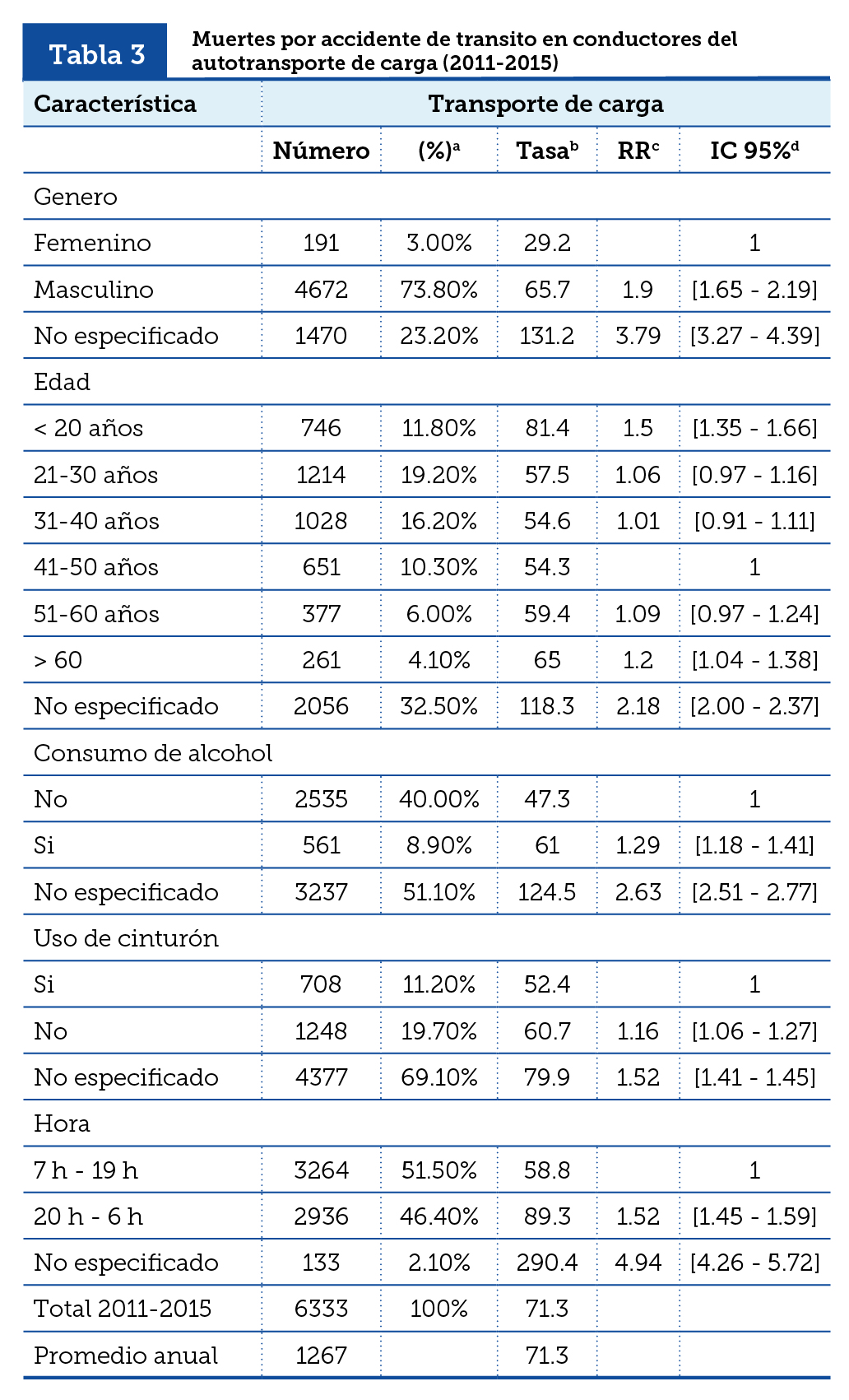 c RR: Razón de Tasas (Rate Ratio). El grupo de referencia RR = 1, es el total nacional de la suma de trabajadores registrados bajo seguros de riesgos de 2011 a 2015 Se consideran los trabajadores de tránsito terrestre, debido a que la cantidad de trabajadores no se desglosa por subcategoría laboral, por lo que las tasas y el RR pueden ser superiores.