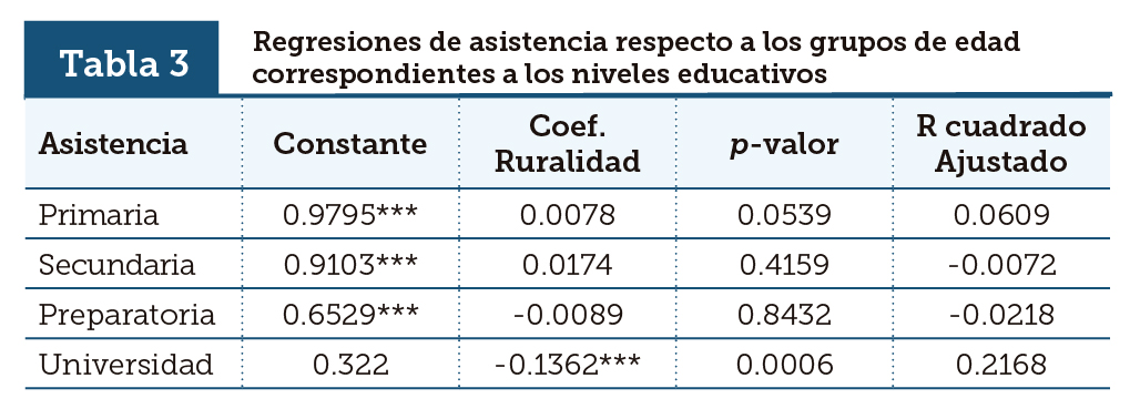 Muestra que para la asistencia en los grupos de edad correspondientes a primaria, secundaria y preparatoria, la ruralidad no tiene un efecto estadísticamente significativo, y que dicho efecto, para los casos de primaria y secundaria, sería positivo en vez de negativo. Para el caso de la asistencia en edad universitaria, la ruralidad tiene un efecto negativo significativo con un coeficiente negativo de -0.1362***, esto es, un incremento de un 1% en la ruralidad, disminuye la asistencia a la universidad en un 0.1363%. El R cuadrado ajustado es de 0.2168, mostrando que la mayor parte de la variación en asistencia se deriva de otras causas. Muy posiblemente el efecto sea derivado de los costes relacionados con tener que trasladarse de municipio para realizar estudios superiores.