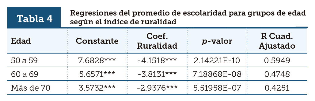 Si realizamos una estimación con un modelo de regresión simple de los promedios de años de educación entre los 46 municipios para las personas mayores (50 a 60, 60 a 70 y más de 70) observamos que la ruralidad disminuye significativamente los años de estudio reportados en promedio. Para el grupo de edad de 50 a 60 años, la ruralidad presenta un coeficiente de -4.1518, para el grupo de 60 a 70 de -3.8131 y para los mayores de 70 de -2.9377. En cada caso la constante es altamente significativa y también disminuye para cada grupo de edad. La ruralidad afecta de manera negativa a los grupos de edad avanzada, dada la dificultad al acceso a la educación que existió cuando estaban en edad escolar8.