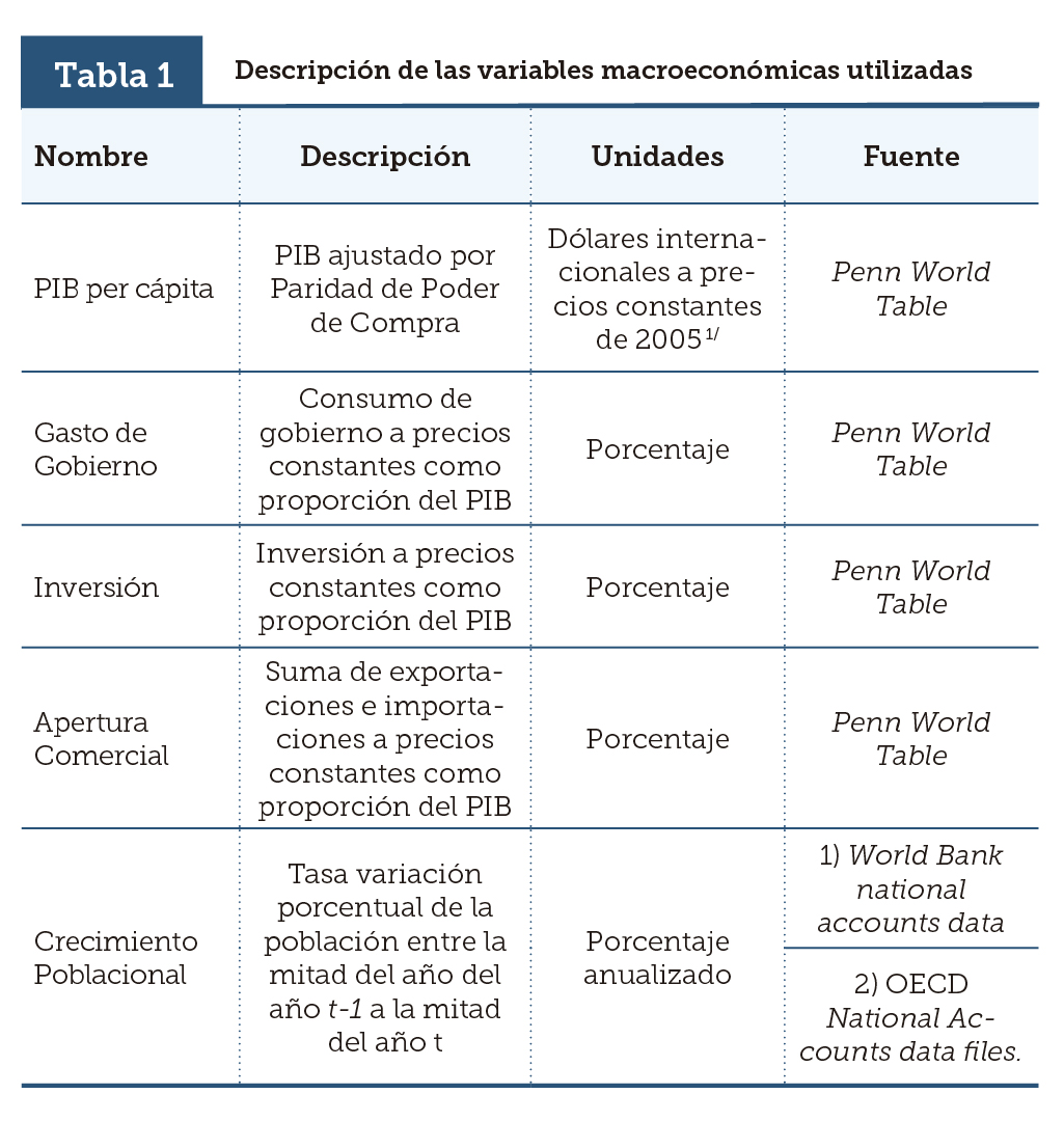 Las variables económicas son promediadas para periodos de longitud fija que intentan reflejar el mediano plazo: para la muestra 1 los promedios se calcularon sobre quinquenios sin traslape, mientras que para la muestra 2, los promedios fueron calculados sobre cuatrienios sin traslape.