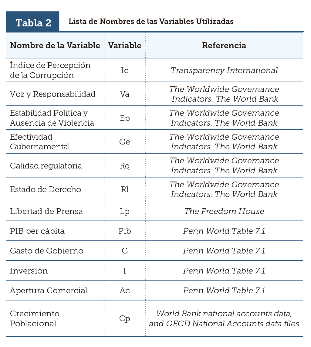 Nuestra contribución se centra en dos ejes principales: 1) la utilización de una medida de corrupción de creación relativamente reciente, como es el Corruption Perceptions Index (CPI) calculado por Transparencia Internacional, junto con los indicadores de gobernabilidad elaborados por el Banco Mundial; 2) la utilización del modelo de ecuaciones simultáneas propuesto por Zellner (1962) y adaptado a técnicas para datos panel, aunque también utilizamos el modelo de datos panel que estima las ecuaciones por separado para contrastar los resultados de nuestras estimaciones con trabajos previos.