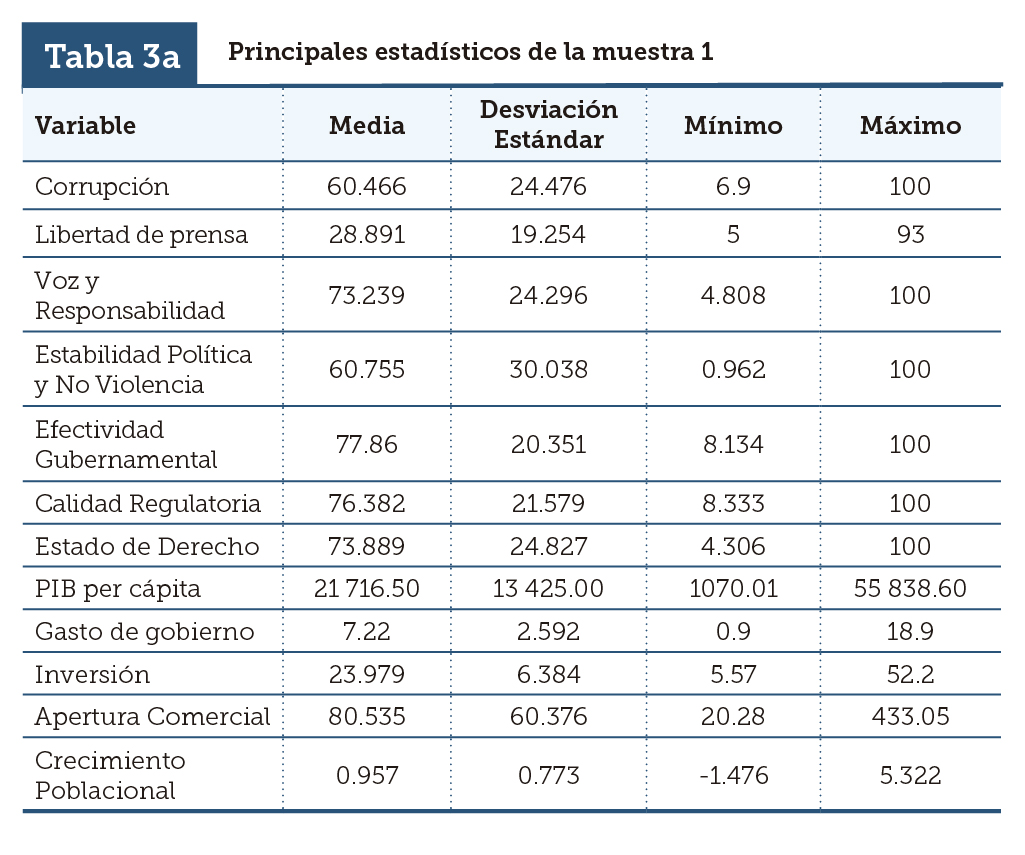 Para este trabajo se utilizan dos muestras: la muestra 1 consiste en 41 países para los cuales la serie de datos del CPI estaba completa para el periodo 1996-2010, mientras que la muestra 2 está compuesta de 34 países que tienen completa la información para el CPI solo para 1999-2010. Es de destacar que no hay traslape entre los países que conforman las dos muestras y que, por tanto, el conjunto de las dos muestras comprende a 75 países distintos para cada uno de los cuales tenemos un conjunto de variables de control que se describen en las tablas 2, 3a y 3b.