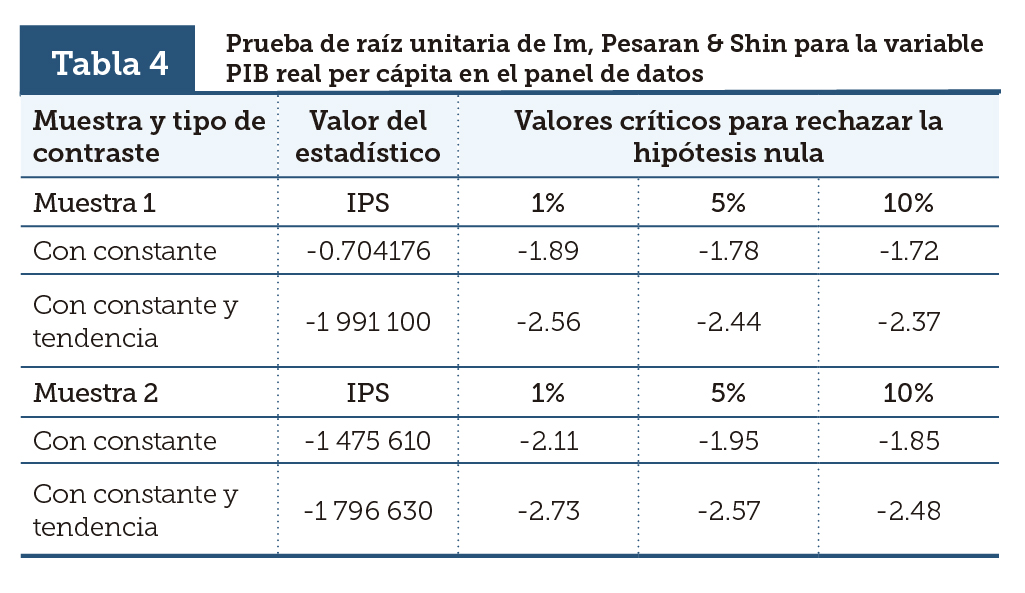 | Tabla 4 | Prueba de raíz unitaria de Im, Pesaran & Shin para la variable PIB real per cápita en el panel de datos |