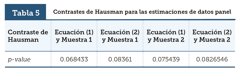 Cabe destacar que, al aplicar la prueba de Im, Pesaran & Shin (2003) al PIB real per cápita, no se pudo rechazar la hipótesis nula de que la serie posee una raíz unitaria. Los resultados de esta prueba para las dos muestras se presentan en la tabla 4. Por esta razón, utilizamos la tasa de crecimiento del PIB real per cápita en todas nuestras estimaciones -que sí es una variable estacionaria de acuerdo con la misma prueba. Asimismo, al aplicar las pruebas de normalidad para los residuos estimados, no se pudo rechazar la hipótesis nula de que estos últimos se distribuyen normalmente para todos los modelos estimados.