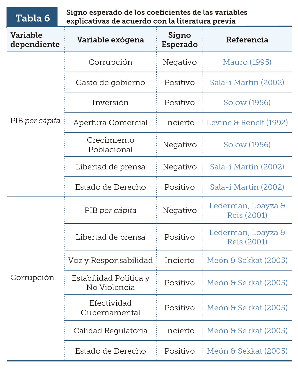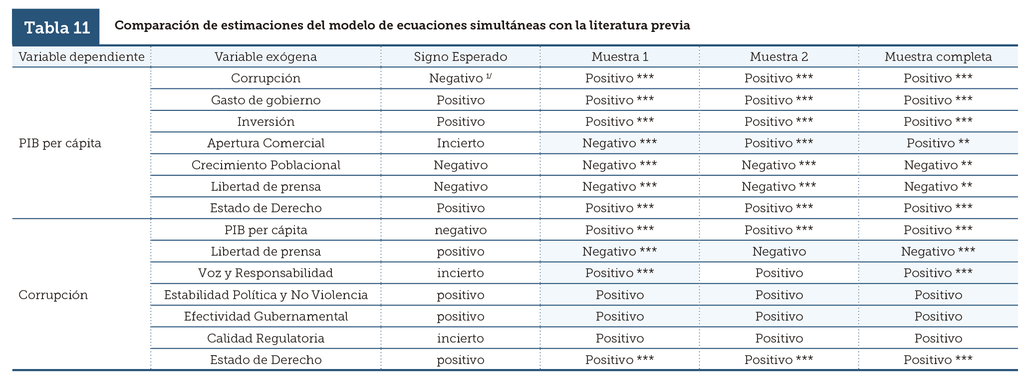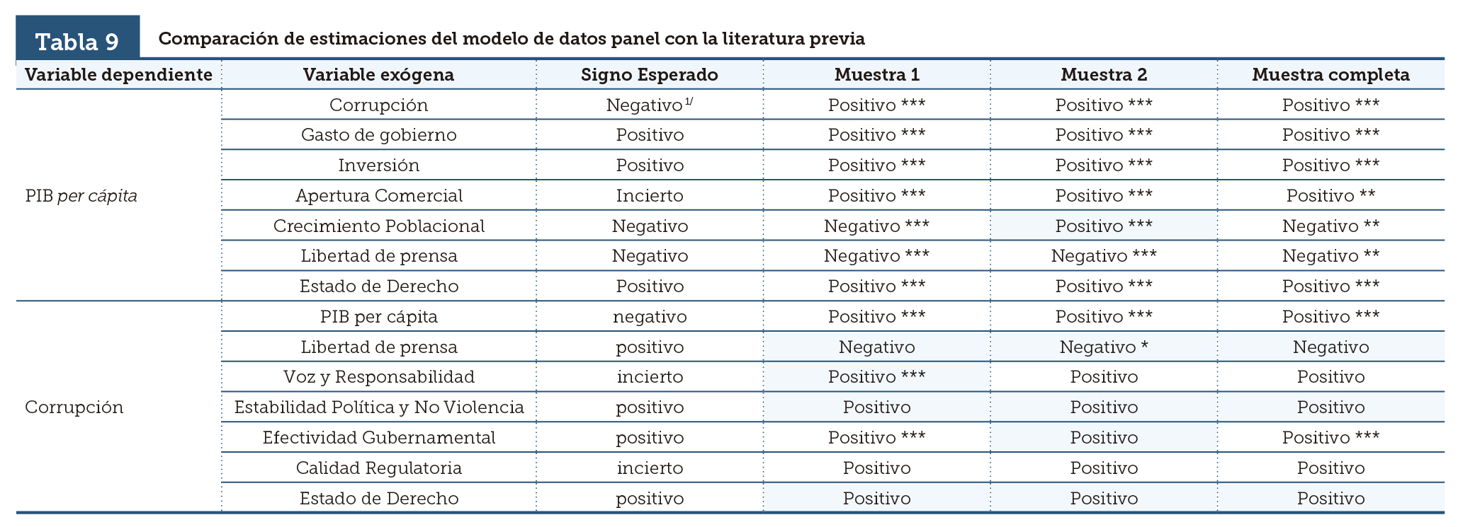 | PIB per cápita | Corrupción | Negativo 1/ | Positivo *** | Positivo *** | Positivo *** |