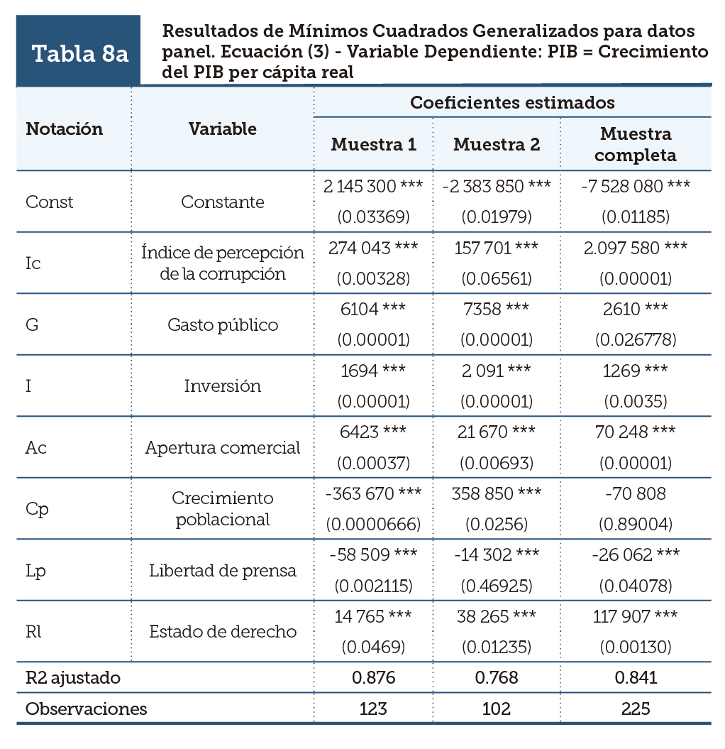 Los resultados de nuestras estimaciones para un panel de 75 países muestran una evidencia indisputable de la retroalimentación simultánea entre el crecimiento económico per cápita y la percepción que los ciudadanos tienen respecto del nivel de corrupción existente en las instituciones públicas de su país. En particular, instituciones públicas saludables, en el sentido de que poseen bajos niveles de corrupción, aceleran el proceso de crecimiento económico de su país, mientras que tasas de crecimiento económico elevadas tienden a producir instituciones públicas saludables en el sentido antes mencionado. Más aún, esta relación se ve fortalecida cuando está asociada con indicadores de gobernabilidad positivos, como son la Libertad de Prensa y el Estado de Derecho. Cabe mencionar que Voz y Responsabilidad están asociados con instituciones públicas con bajos niveles de corrupción, mientras que Estabilidad Política y no Violencia, Efectividad Gubernamental y Calidad Regulatoria no muestran una contribución significativa para la obtención de instituciones públicas saludables.