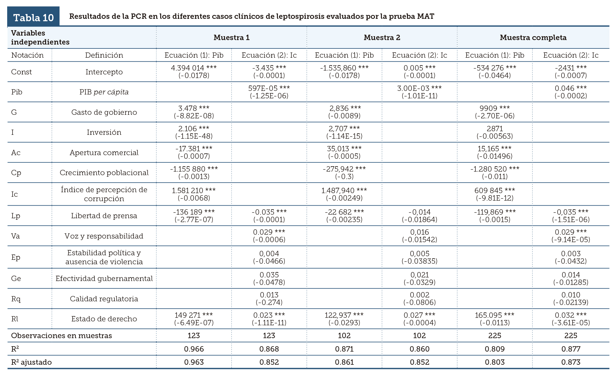 Sin embargo, la estimación de la ecuación que explica a la corrupción no parece ser tan exitosa. Como se aprecia en la tabla 9, de todos los indicadores de Gobernabilidad, solo la Libertad de Prensa, Voz y Responsabilidad y el Estado de Derecho tienen un impacto significativo sobre la corrupción y se logró explicar sólo el 85.2%, 85.2% y 87.3% del comportamiento de la corrupción en la muestra 1, la muestra 2 y la muestra completa, respectivamente.