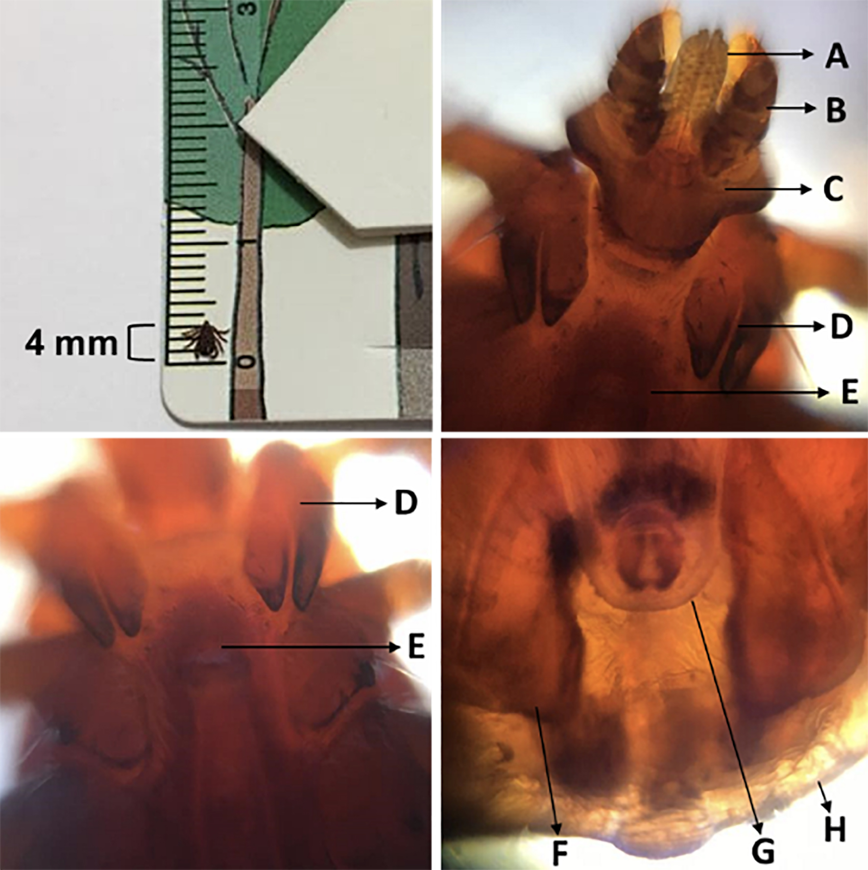 Muestra de R. sanguineus tomadas con una cámara de teléfono móvil sobre un Foldscope donde se muestran: A. Quelíceros, B. Pedipalpos, C. Base del gnatosoma, D. Primera coxa, E. Apertura genital, F. Escamas anales, G. Surco anal y H. Festones. La amplificación de todas las imágenes es de 140X con el lente del microscopio.