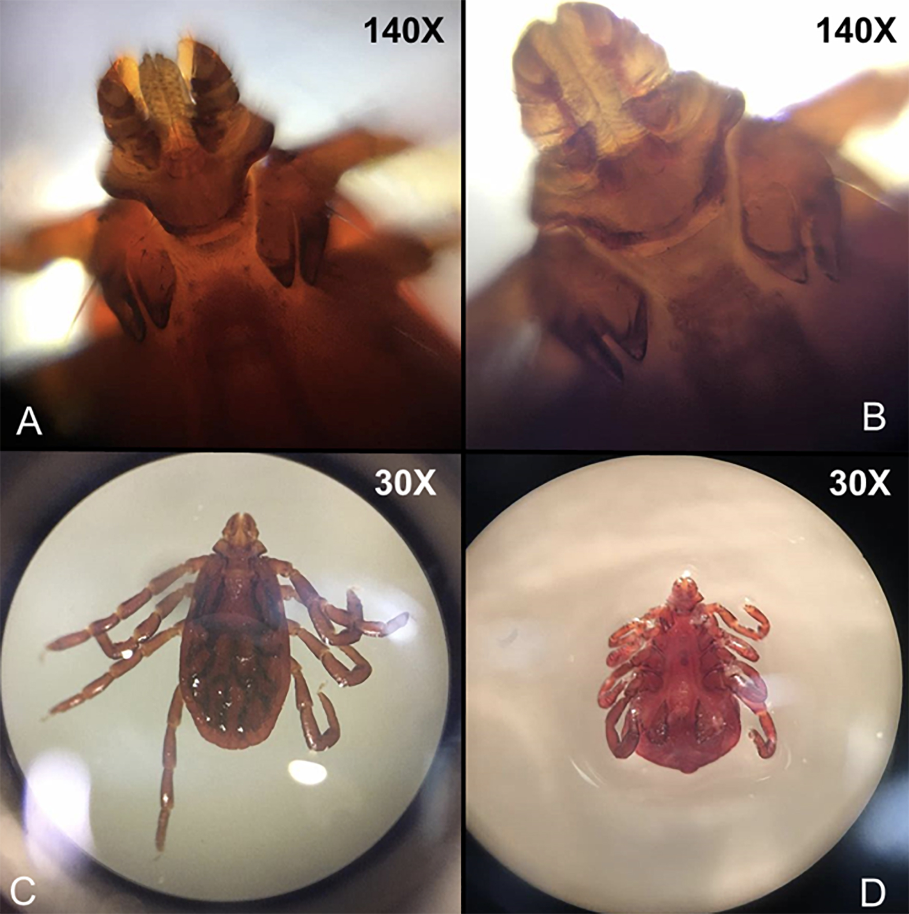 Muestra: Garrapata (R. sanguineus). A: Foldscope modificado B: Foldscope original c/Led C: Estereoscopio S/Luz integrada D: Estereoscopio C/luz integrada.