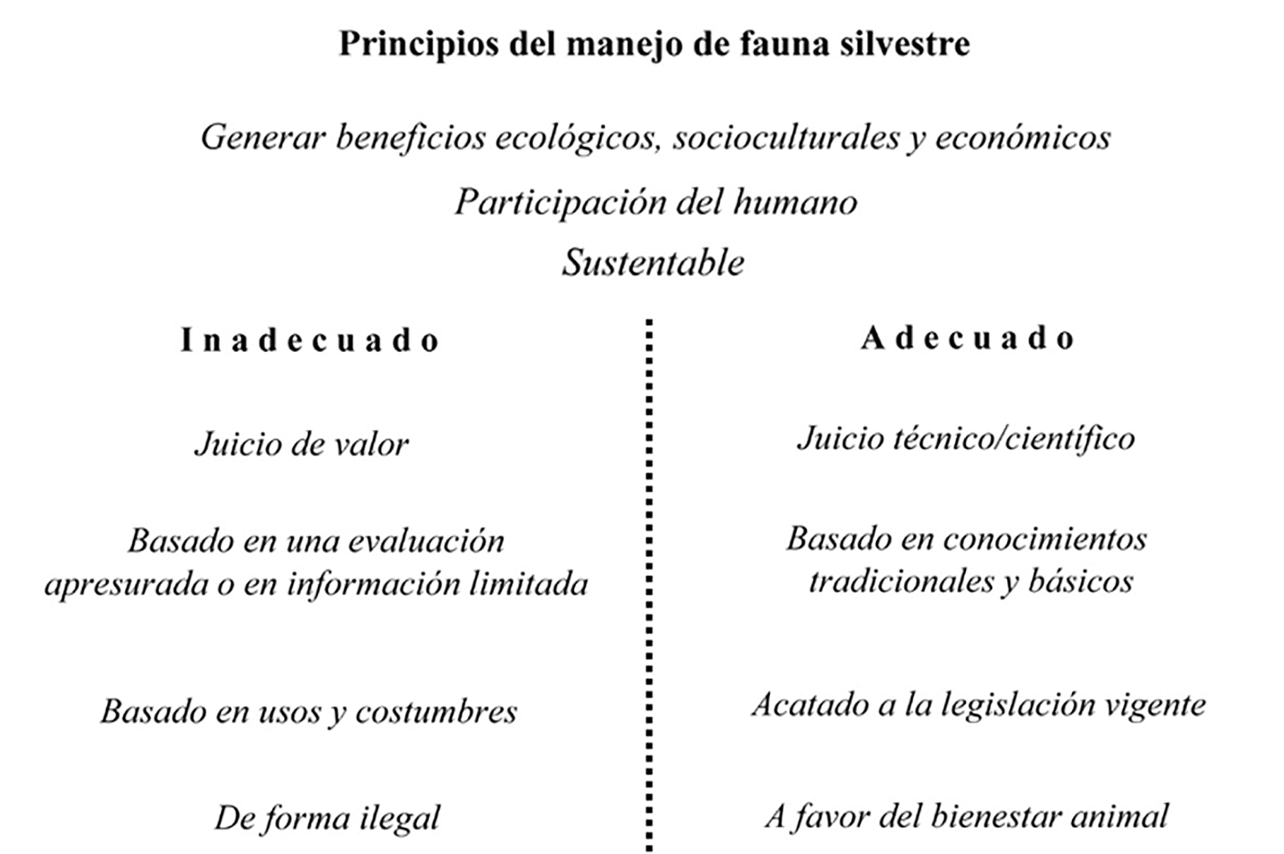 Para aplicar cualquier acción de manejo de fauna silvestre es necesario realizar una evaluación técnica/científica, que se adecúe a la legislación vigente, que se conozcan aspectos biológicos y ecológicos de las especies silvestres y de su hábitat y que se considere el bienestar animal (figura 1). El propósito de realizar el manejo de fauna silvestre nunca tendrá que estar enmarcado por un juicio de valores morales, al contrario tiene que estar basado en la mayor cantidad de información disponible de calidad, para la aplicación de estrategias, métodos o actividades que garanticen un manejo adecuado.