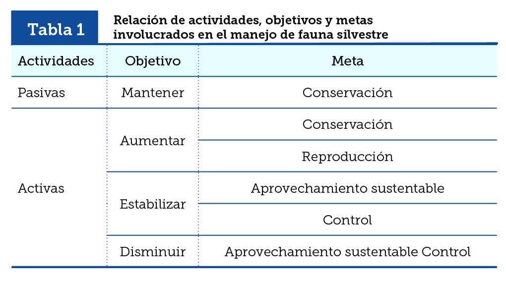 | Tabla 1 | Relación de actividades, objetivos y metas involucrados en el manejo de fauna silvestre |