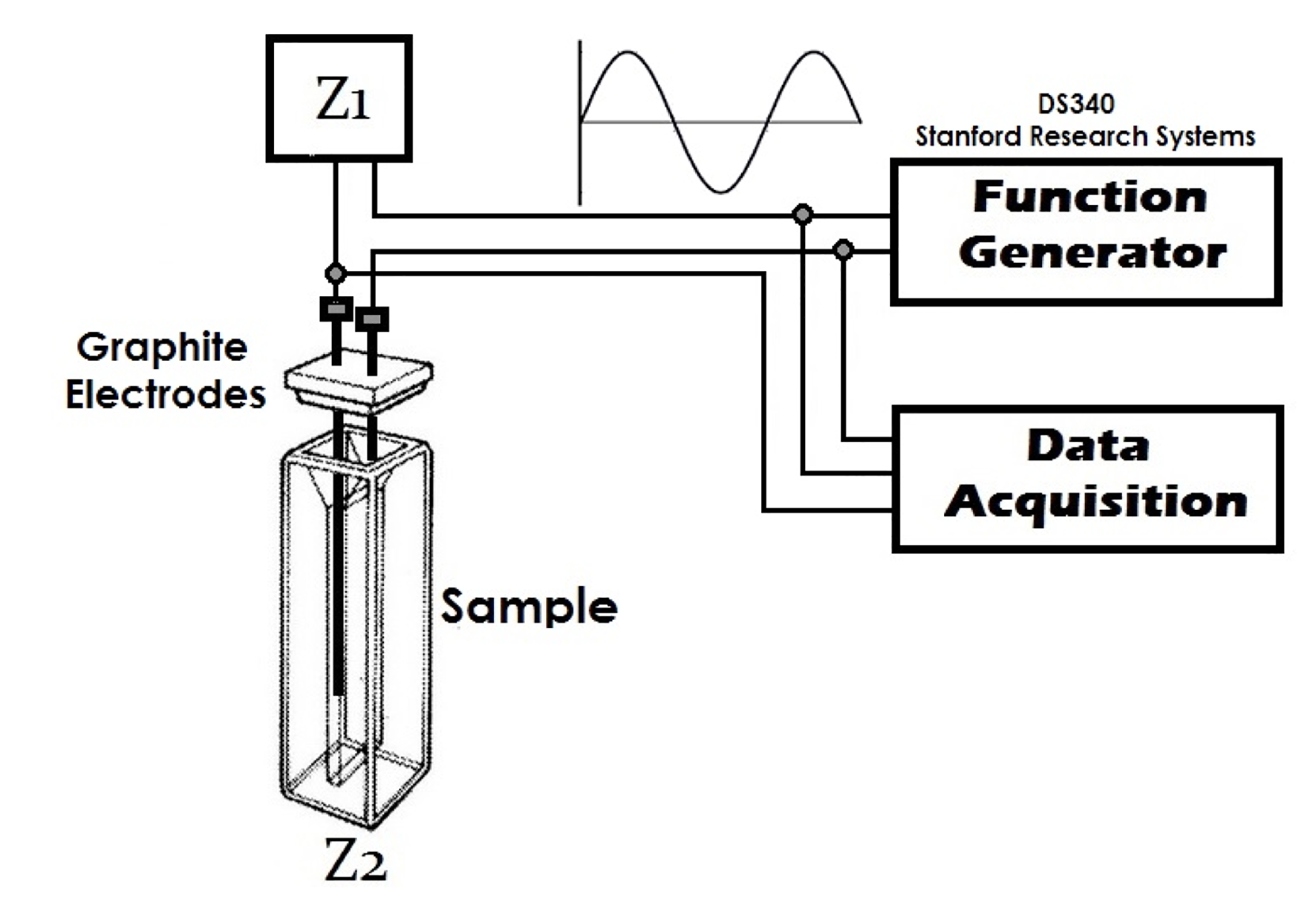 The characterization of the system was achieved using graphite electrodes with a length of 3 cm and a diameter of 0.07 cm. The electrodes were placed on a plastic cover which has an area of 0.81 cm2. The cover was used to seal the plastic cuvette containing the sample to evaluate. The cells volume was 2.8 mL and a signal generator (Stanford Research Systems, Mod. DS340) was used to supply a sine signal with an amplitude of 5 Vpp to the electric circuit varying the frequency of the sine signal in 10 Hz, 50 Hz, 100 Hz, 500 Hz, 1000 Hz, 5000 Hz, 10 000 Hz, 50 000 Hz, 100 000 Hz, 250 000 Hz, 500 000 Hz, 750 000 Hz and 1 000 000 Hz. In figure 1, the used experimental setup is shown.