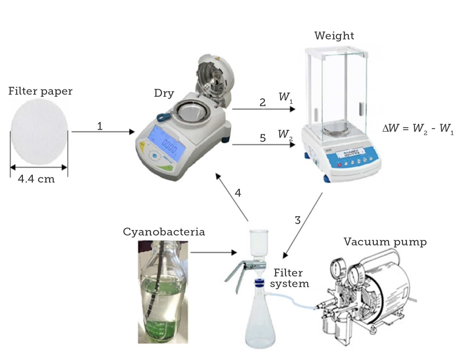 Dry weight measurements were given through drying the filter with a humidity balance PMB (Adam Equipment, Mod.17250) at 140 °C for 5 min; next, it was weighed in an analytical balance (RADWAG Wagi Elektroniczne, Mod. AS 220.R2). The biomass was filtered with the equipment KG 47 GLASS SUPPORT (Advantec MFS, Inc., Mod. 311400) of 300 mL and a Kitasato flask (KIMAX, Mod. 27060) of 1000 mL, as well as with a vacuum pump (WACO, Mod. 73021-00). The filter with living biomass was dried using the humidity balance PMB at 140 °C for 5 min, then it was weighed in the analytical balance. Figure 2 shows the flow of the drying process of the biomass evaluated by electrical admittance.