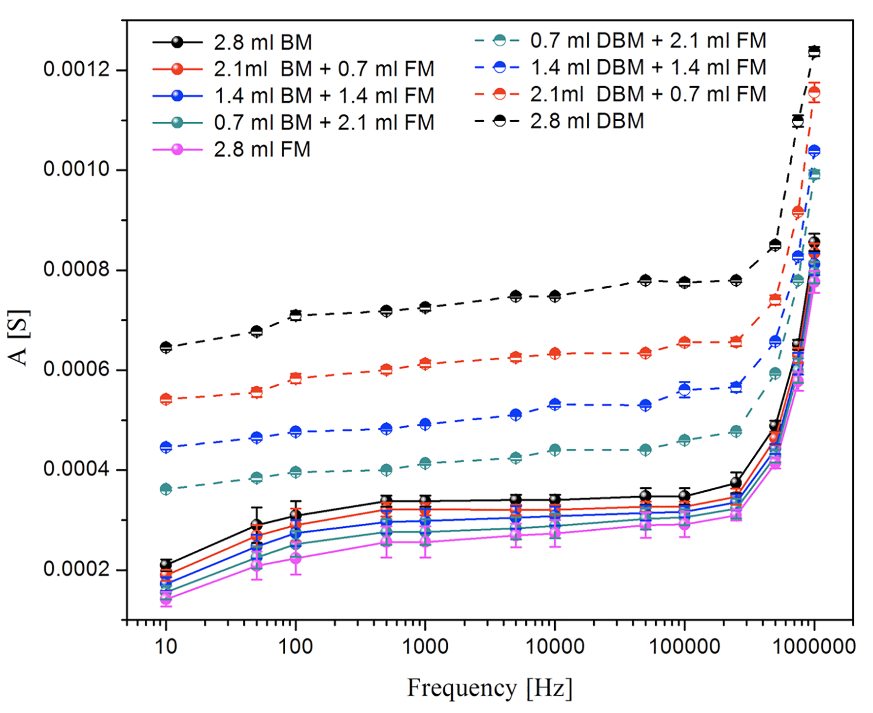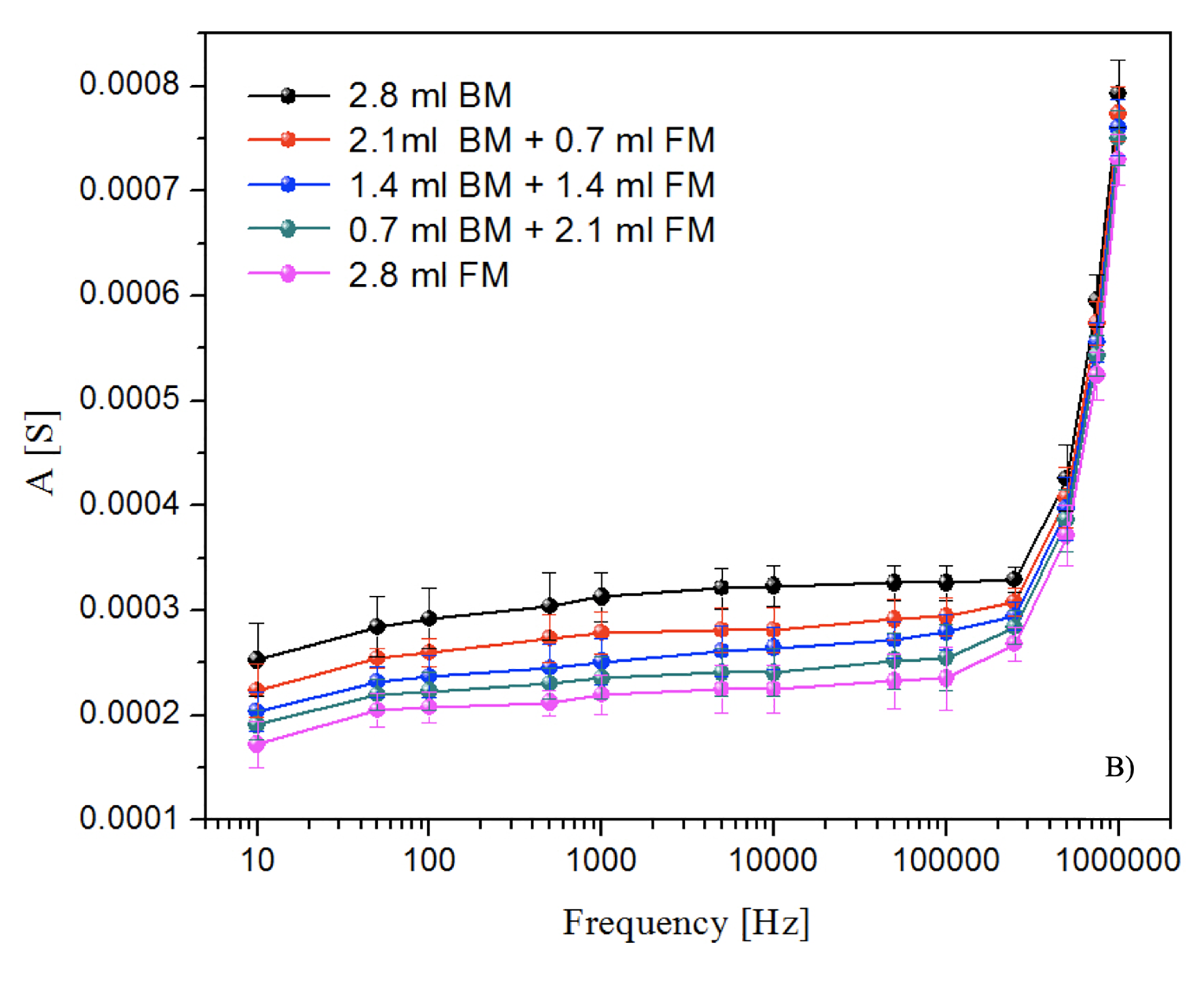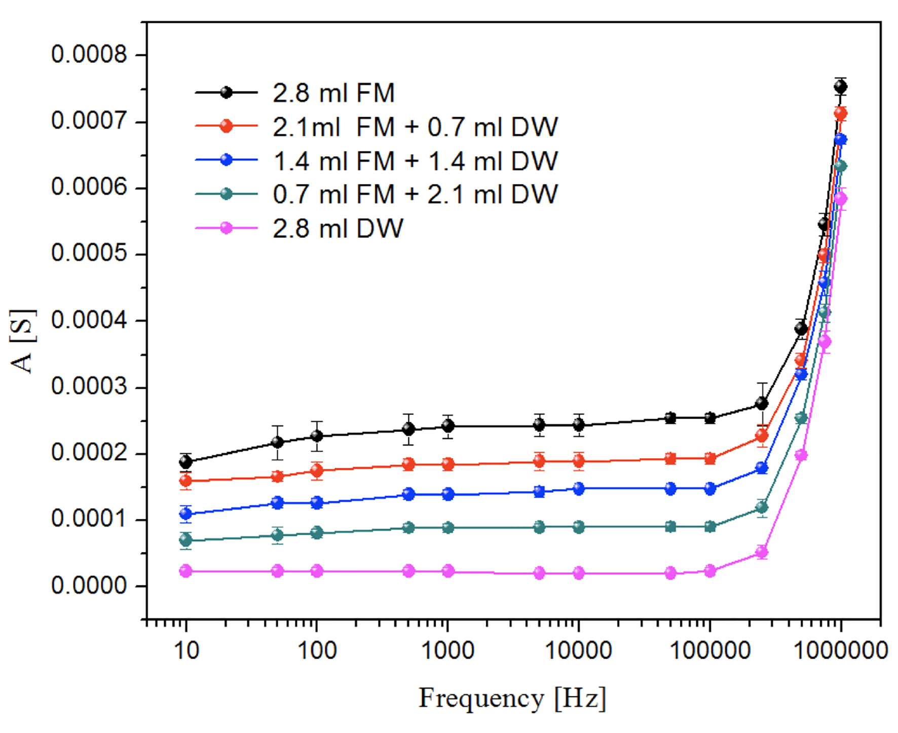 Therefore, for the calibration curves preparation, it was necessary to select a frequency under which the sweeps did not show high variability, whereby the frequency of 50 kHz was chosen. In figure 5, the electrical behavior of the activated biomass prepared with fresh medium is shown. In comparison with the response of the system in the samples of distilled water and fresh medium, a higher electrical response was presented for the living biomass.