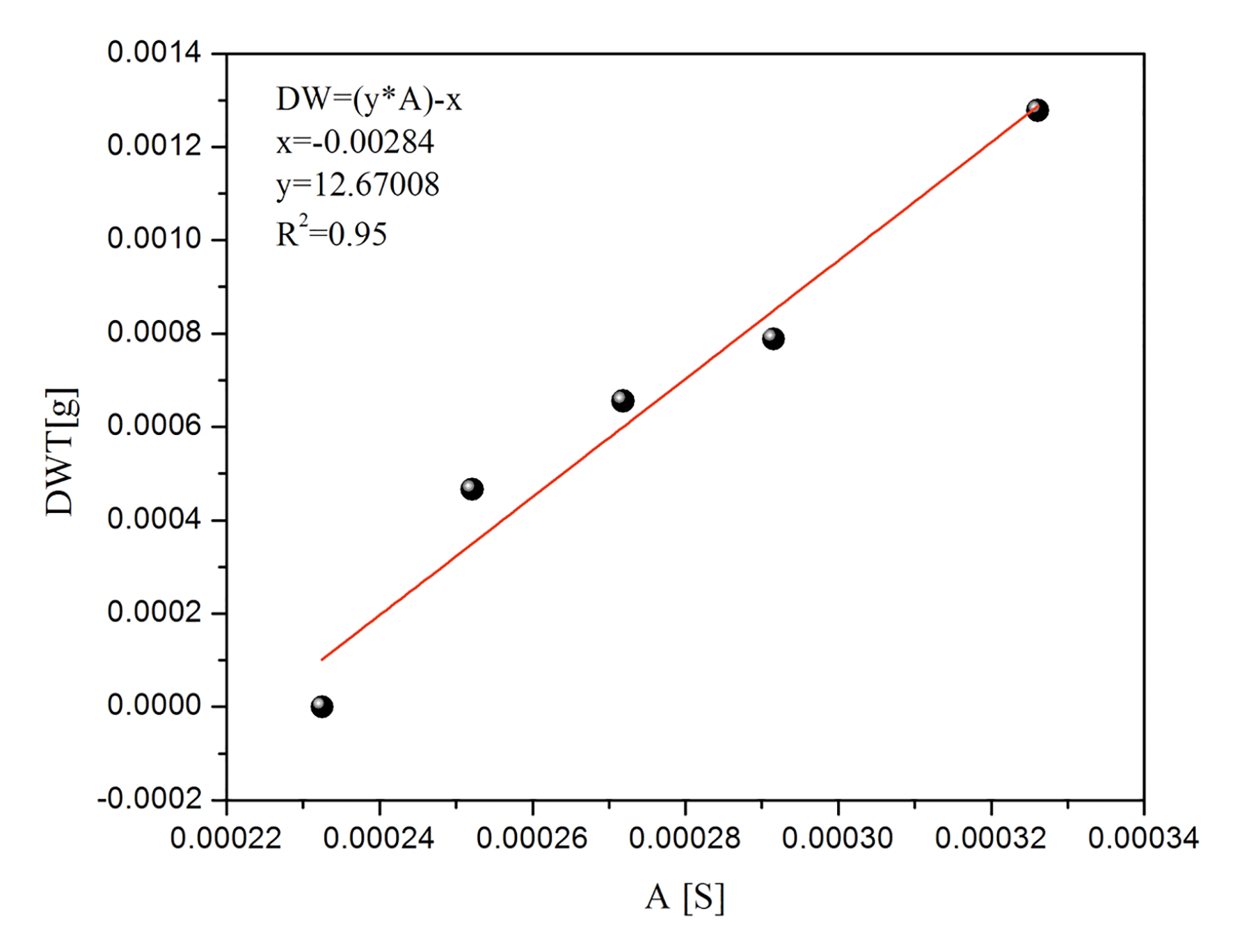 Linear fit calibration curve of Fischerella sp. living biomass obtained at 50 kHz. Abbreviations. A: Admittance; DWT: Dry weight.