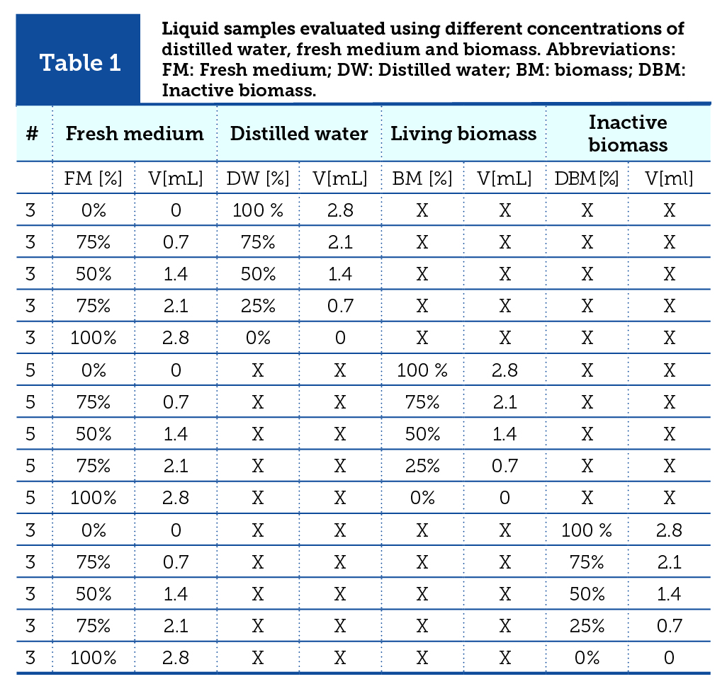 | Table 1 | Liquid samples evaluated using different concentrations of distilled water, fresh medium and biomass. Abbreviations: FM: Fresh medium; DW: Distilled water; BM: biomass; DBM: Inactive biomass. |
