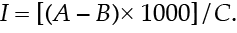 `I = [(A – B)× 1000]/C.` (1)