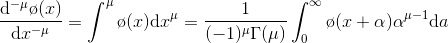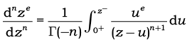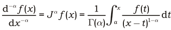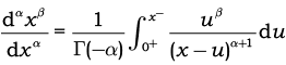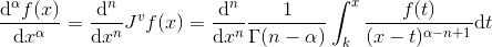 donde $a < x$. La ecuación se puede obtener de (8) haciendo $u^{\beta }=f(t)$ , sustituyendo $\alpha$ por $-\alpha $ y $u$ por $t$. Ahora bien, si $n –1 < a < n$ se puede hacer $\alpha = n –v$, entonces se tiene: