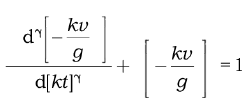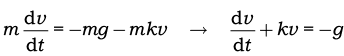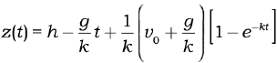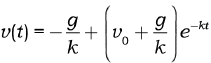 donde $k$ es una constante positiva responsable de la fuerza de resistencia con unidades de segundos inversos, s$^{–1}$, y $–mkv$ representa una fuerza dirigida hacia arriba, ya que tomamos $z$ y $v=z$ positivos en ese sentido, y el movimiento se dirige hacia abajo; o sea $v < 0$ de forma que $–mkv > 0$. Si la condición inicial se considera $v(0) = v_0$, donde $v_0$ es la velocidad inicial del cuerpo cayendo, la solución es: