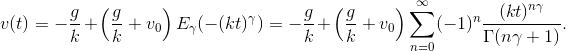 Ahora se analizará el problema anterior desde el punto de vista del cálculo fraccionario. Para ello se harán algunas modificaciones, como se muestra en (40), antes de pasar a la ecuación diferencial de orden fraccionario, a partir de (37). Estas modificaciones consisten en normalizar las variable v y t tomando como base de normalización $-g\: /\: k$ y $1/k$ para la velocidad y el tiempo, respectivamente, de forma que dividiendo $v$ entre –$g\: /\: k$ :