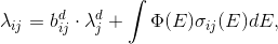 es la probabilidad de producción de i-ésimo núclido por unidad de tiempo a partir de la destrucción del j-ésimo núclido como resultado de una interacción nuclear, `\lambda _{j}^{d}` es la constante de decaimiento del `j`-ésimo núclido, `b _{ij}^{d}` es la proporción de ramificación del decaimiento del `j`-ésimo núclido en el `i`-ésimo núclido, `\Phi` es el flujo de neutrones de energía `E` y `\sigma _{ij}` es la sección eficaz para neutrones de energía `E` para la producción del i-ésimo núclido por neutrones durante la interacción con el `j`-ésimo núclido.