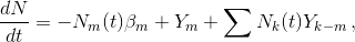 `Y_{k-m}` la probabilidad de transmutación del isótopo `k`, por decaimiento o absorción en el isótopo `m`.
