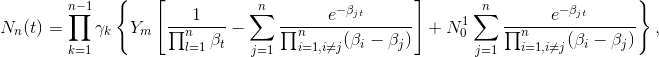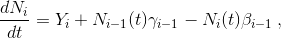 donde las cantidades son ahora indexadas por el orden, en el cual aparecen dentro de una secuencia dada, y `\gamma _{i-1}` es la probabilidad de transmutación de que se forme el núclido del elemento `N_i`. Las soluciones de cada cadena lineal determinan una densidad parcial del núclido `N_i` y se calcula por la siguiente ecuación: